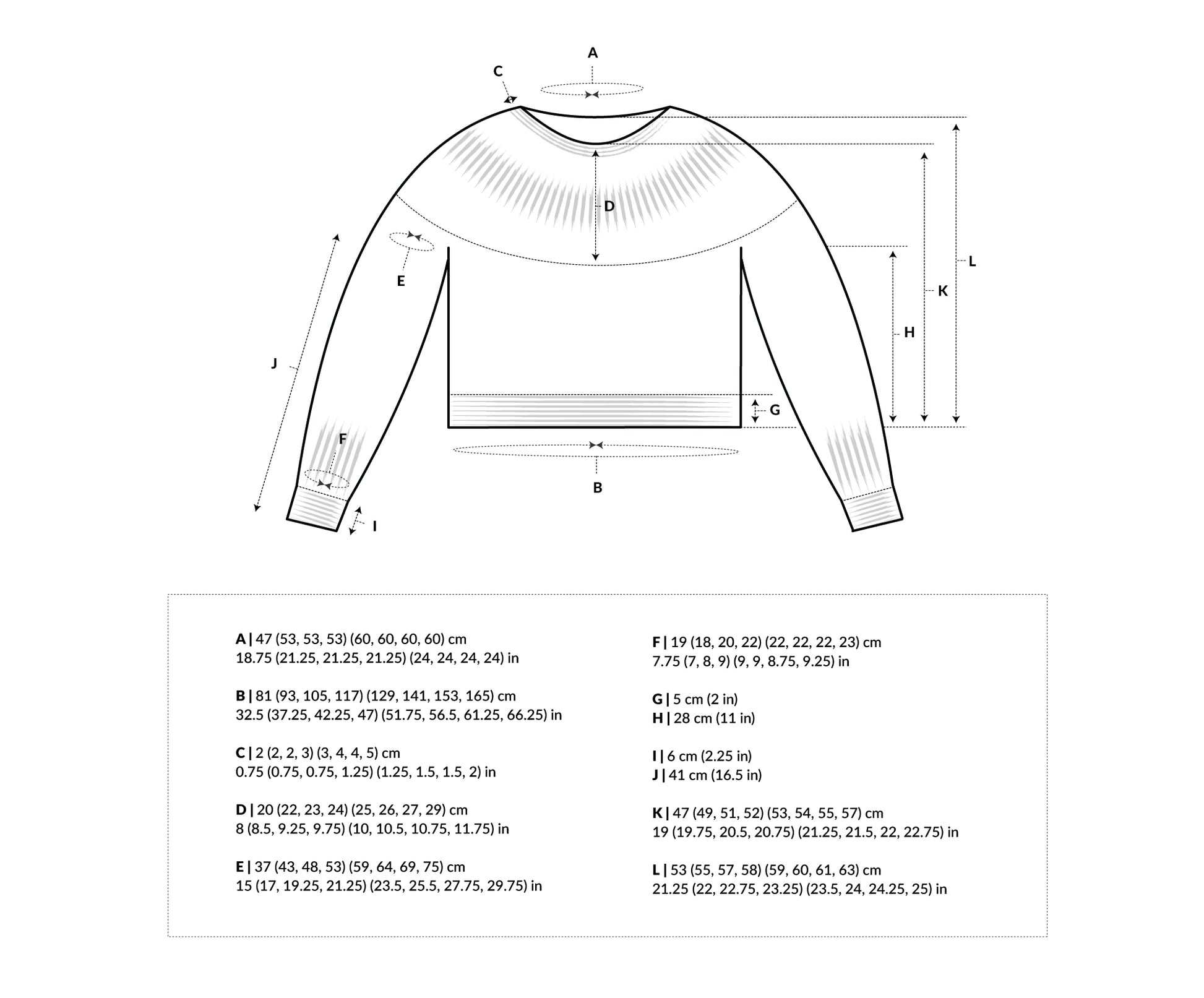 The pattern is written for eight sizes 1 (2, 3, 4) (5, 6, 7, 8) with a finished bust circumference of ca. 81 (93, 105, 117) (129, 141, 153, 165) cm //32.5 (37.25, 42.25, 47) (51.75, 56.5, 61.25, 66.25) in incl. ca. 10 cm (4 in) of the recommended positive ease.