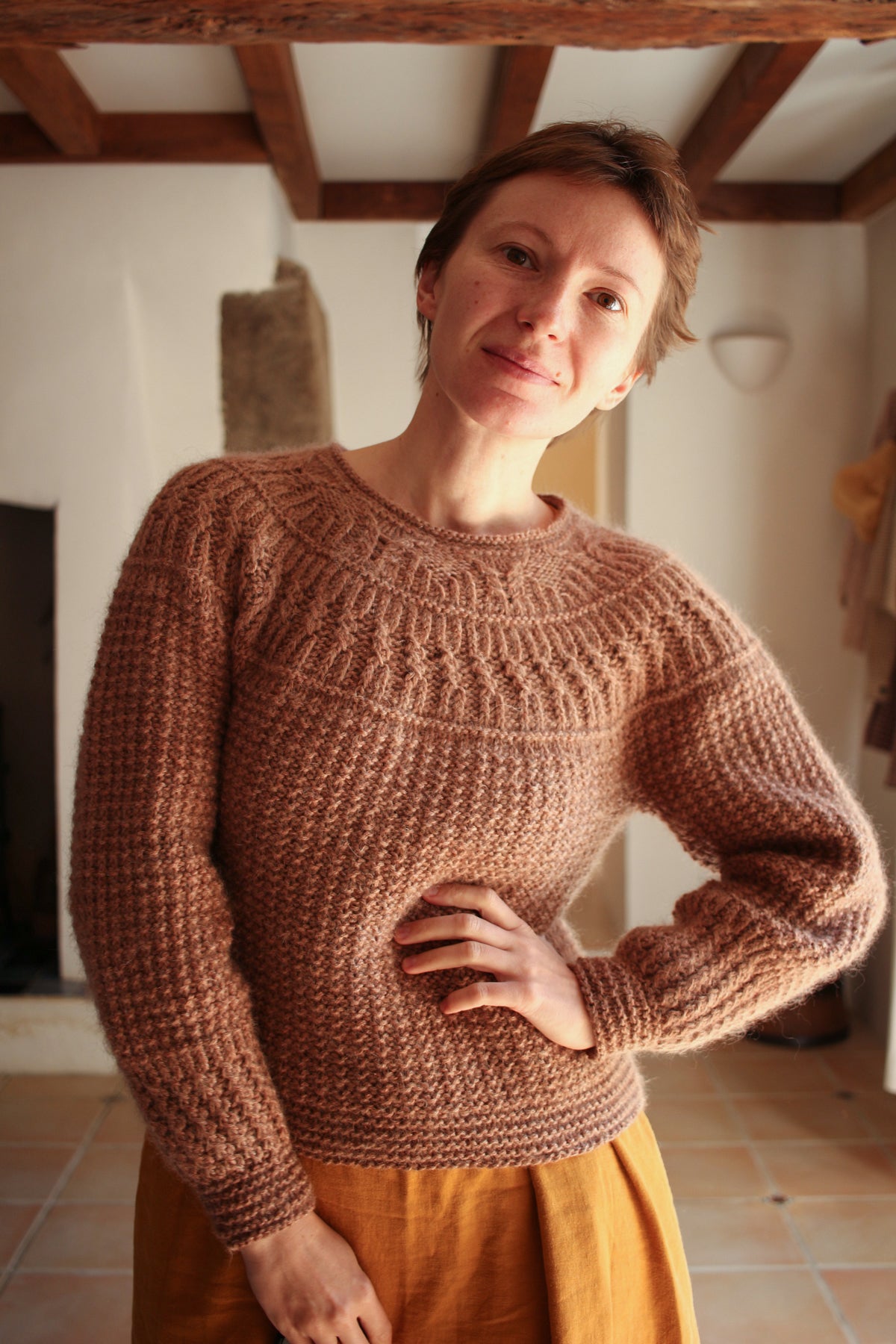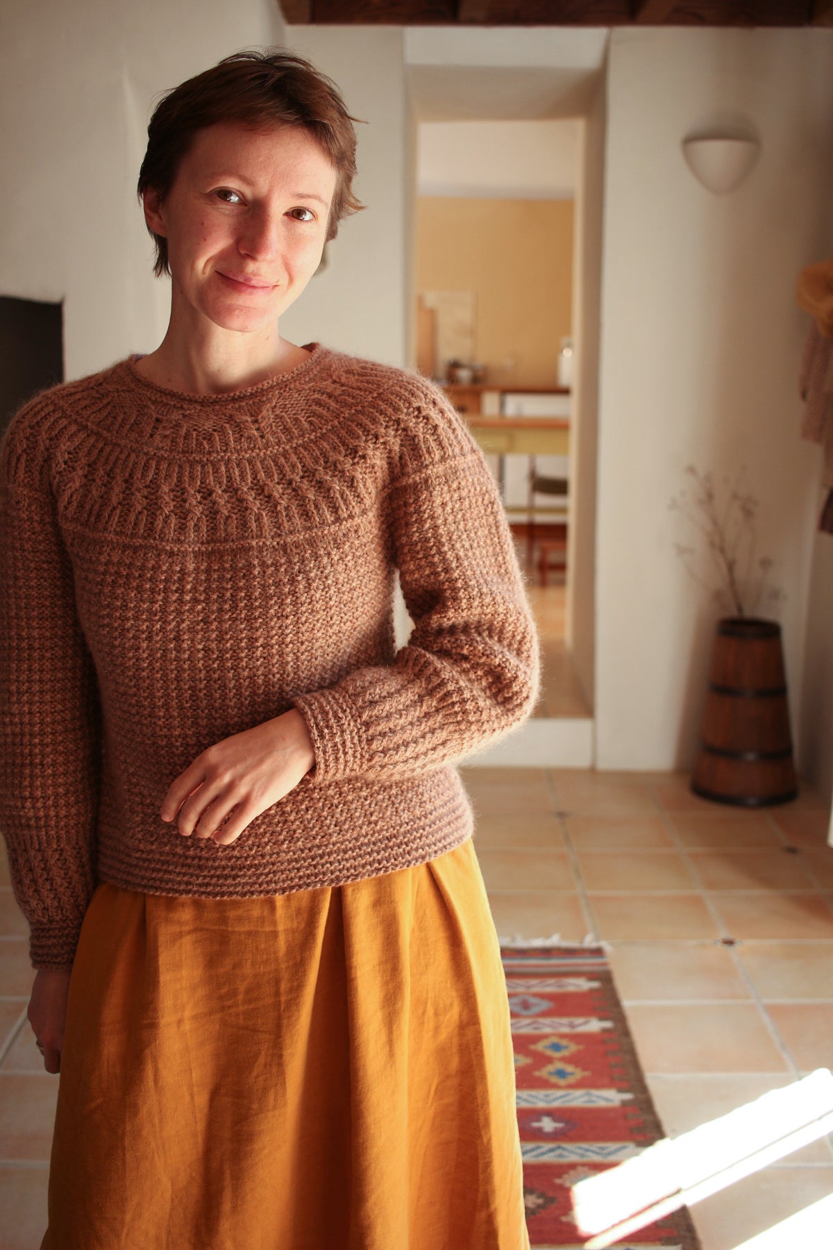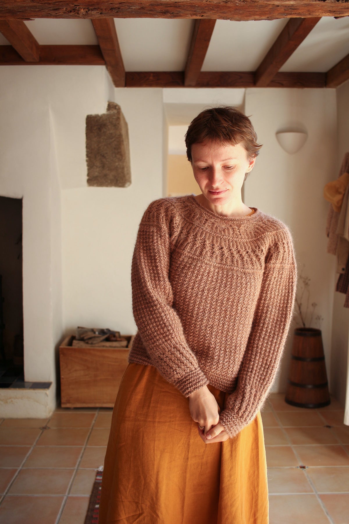 This round-yoke pullover is knit top-down in the round. The lower yoke, body, and most of the sleeves are worked in a waffle pattern on the wrong side of the fabric. The design combines a variety of textured patterns, including half-twisted rib, cables, and garter stitch.