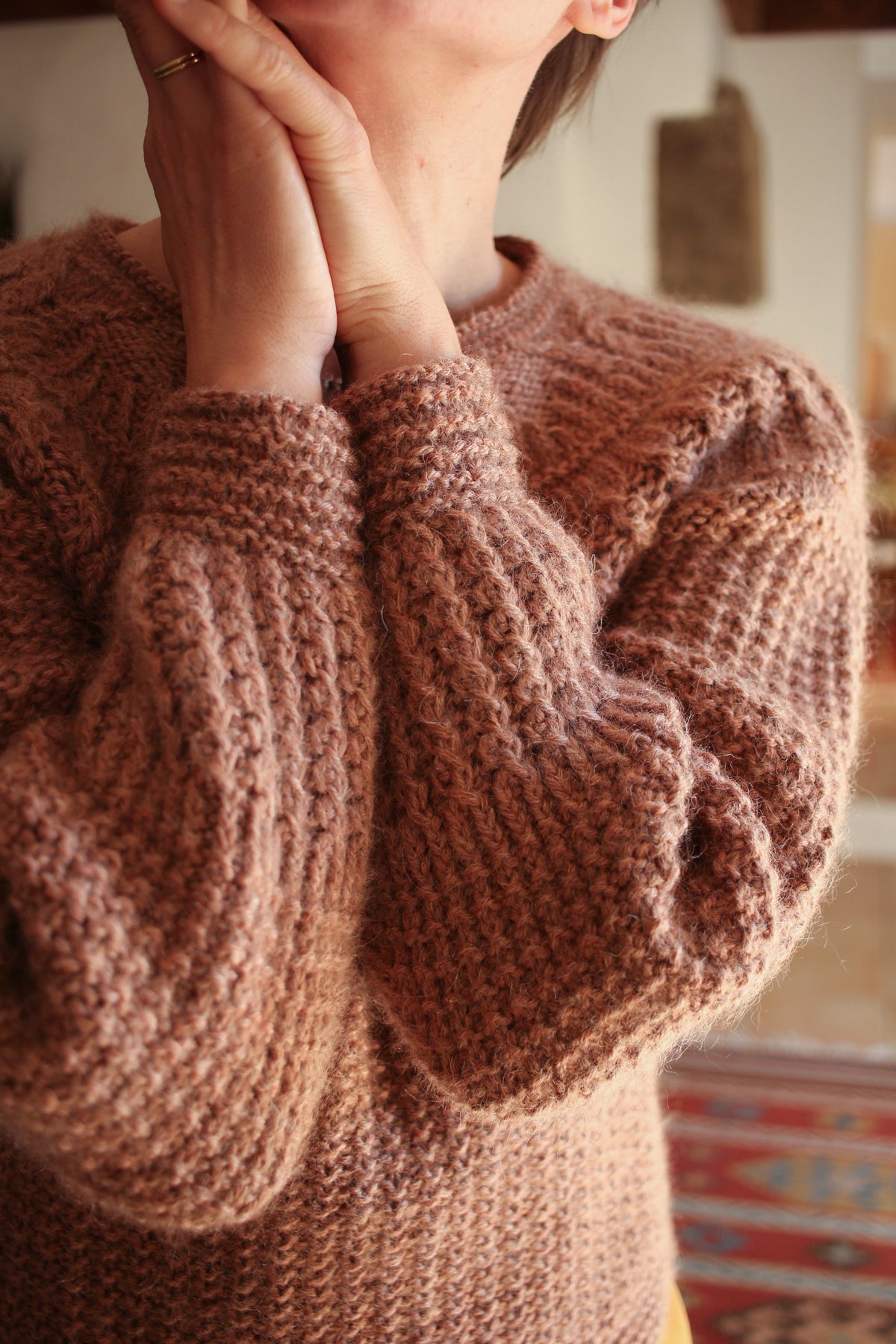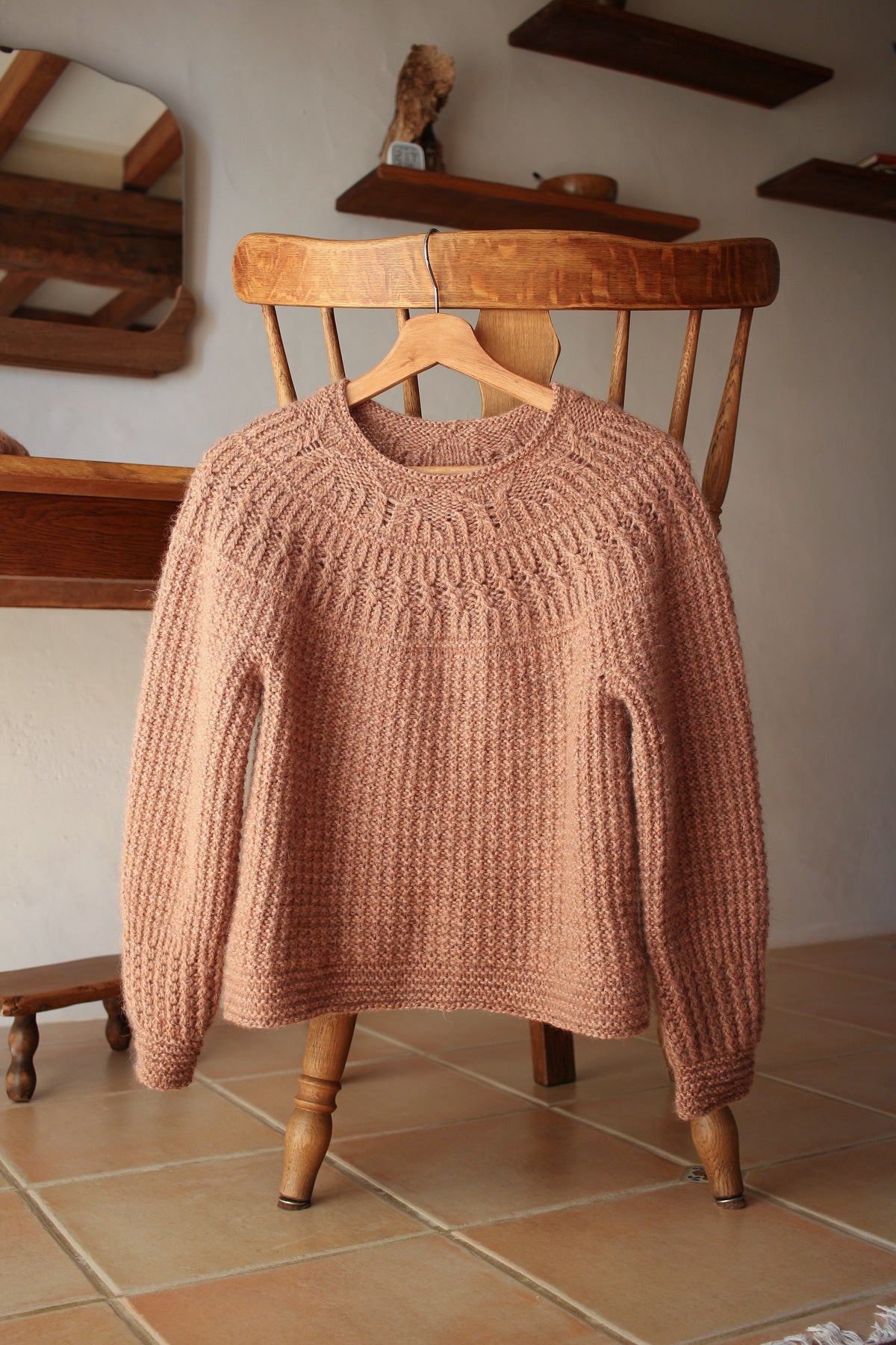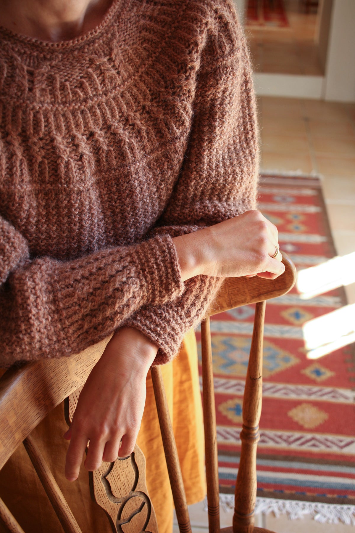 This round-yoke pullover is knit top-down in the round. The lower yoke, body, and most of the sleeves are worked in a waffle pattern on the wrong side of the fabric. The design combines a variety of textured patterns, including half-twisted rib, cables, and garter stitch.