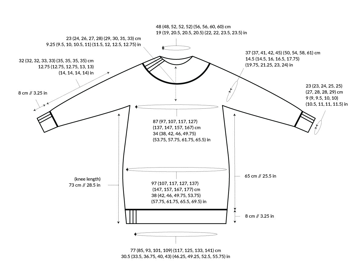 The pattern is written for nine sizes 1 (2, 3, 4, 5) (6, 7, 8, 9) with a finished bust circumference of ca.87 (97, 107, 117, 127) (137, 147, 157, 167) cm // 34 (38, 42, 46, 49.75) (53.75, 57.75, 61.75, 65.5) in incl. 12.5 cm (5 in) of recommended positive ease.