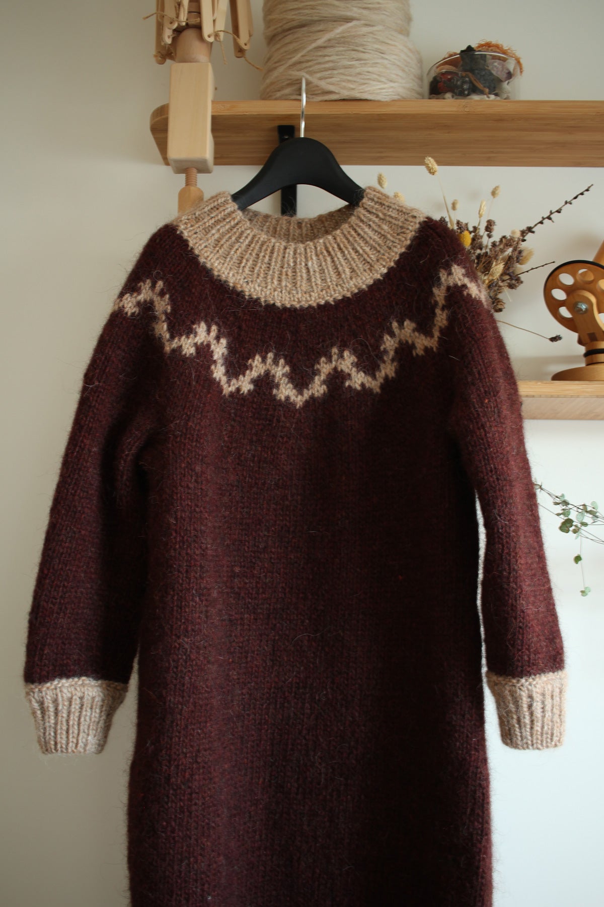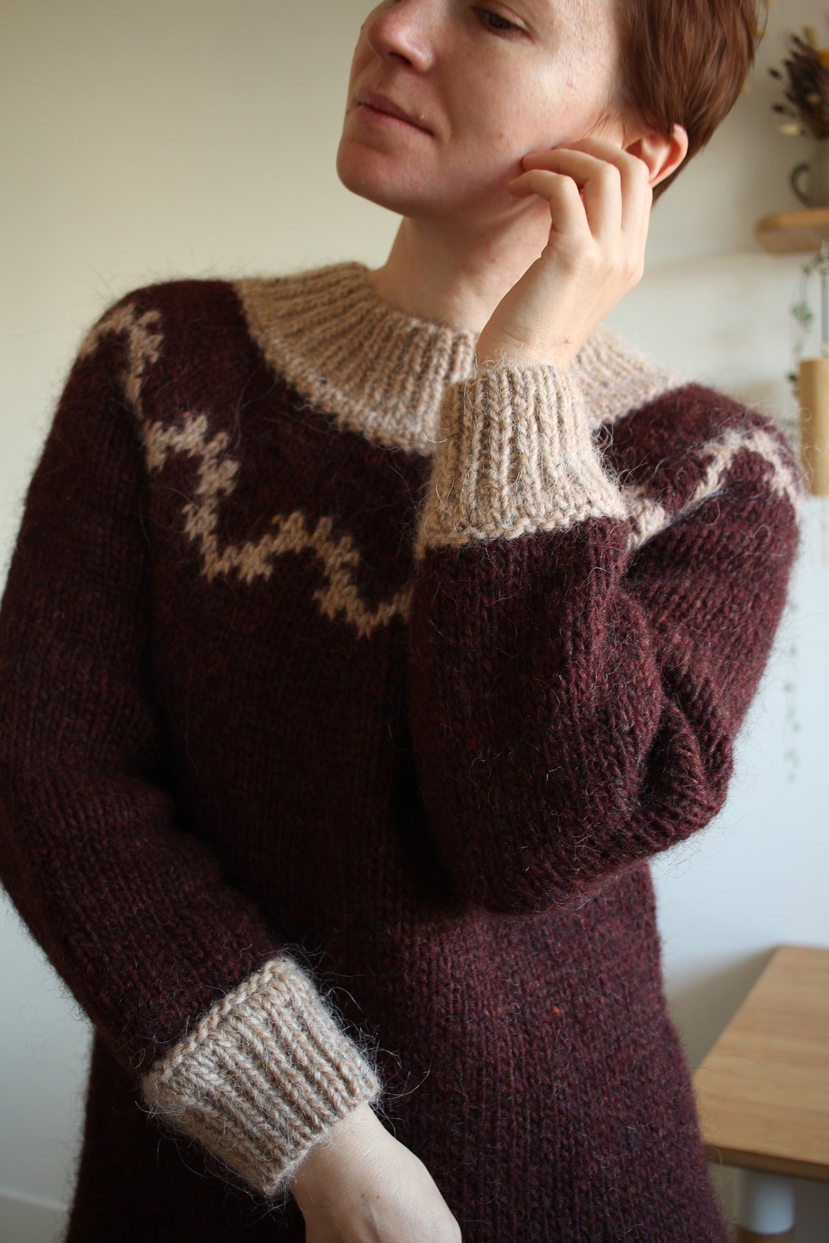 Vinber from Icelandic “grape” or “wine berry” carries its name not only because of the main yarn colour I chose for my sample, but also because it is designed in a pure Icelandic wool.