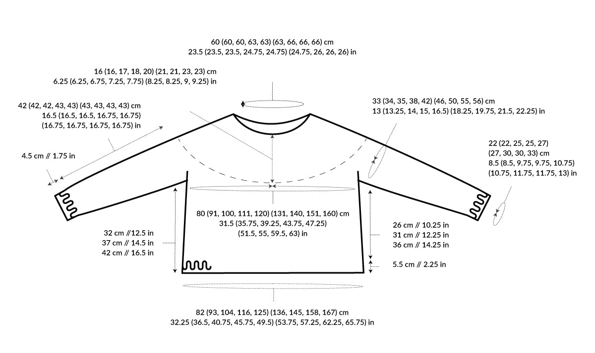 The pattern is written for nine sizes 1 (2, 3, 4, 5) (6, 7, 8, 9) with a finished bust circumference of ca. 80 (91, 100, 111, 120) (131, 140, 151, 160) cm // 31.5 (35.75, 39.25, 43.75, 47.25) (51.5, 55, 59.5, 63) in incl. 6 cm (2.25 in) of the recommended positive ease.