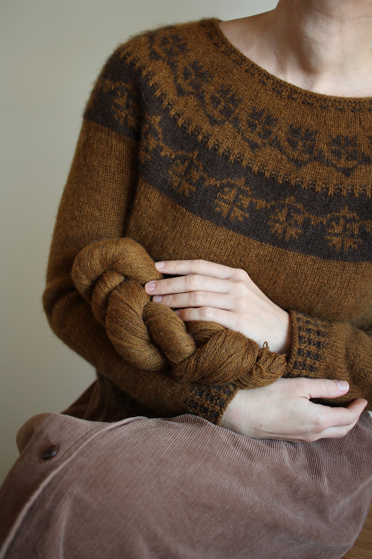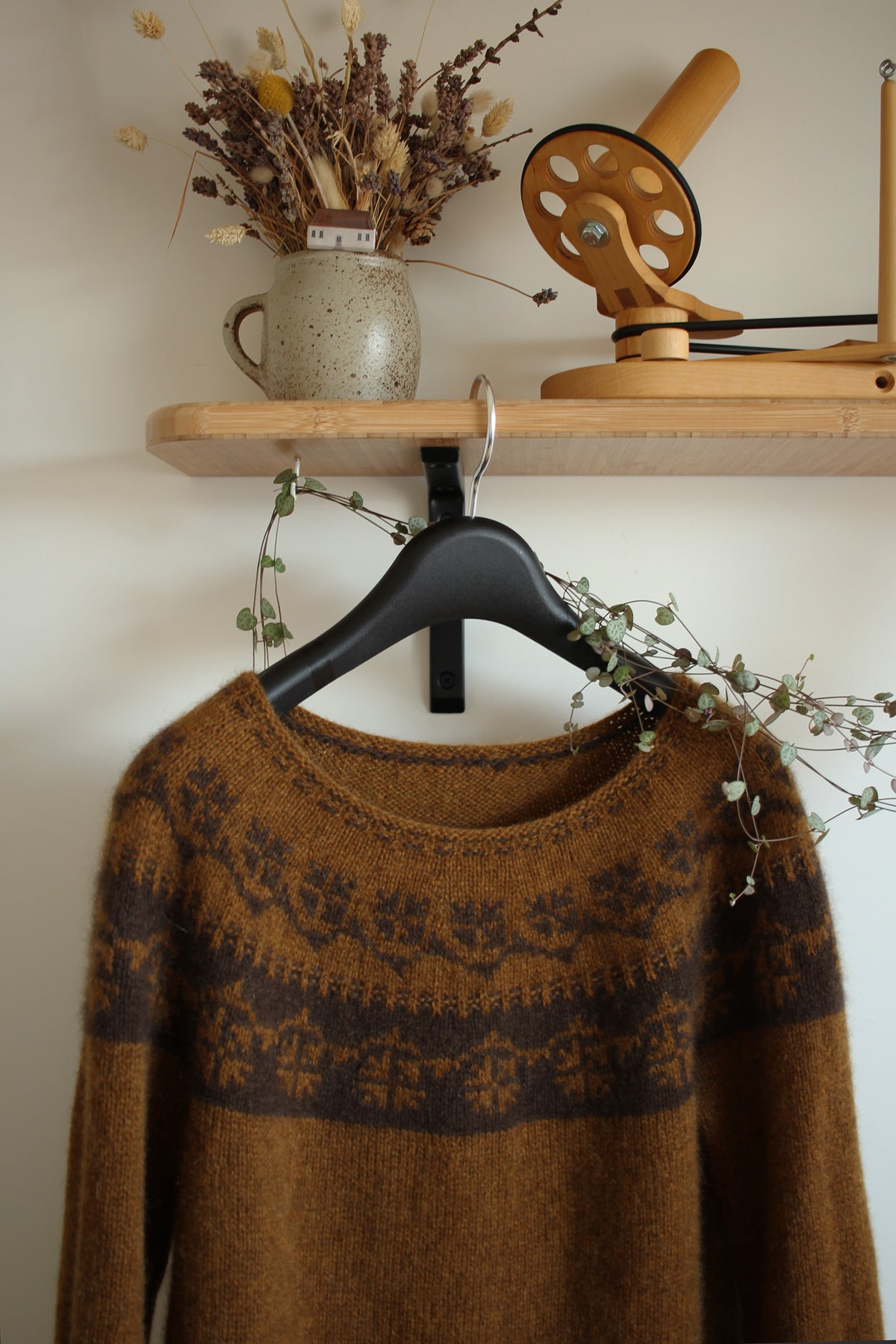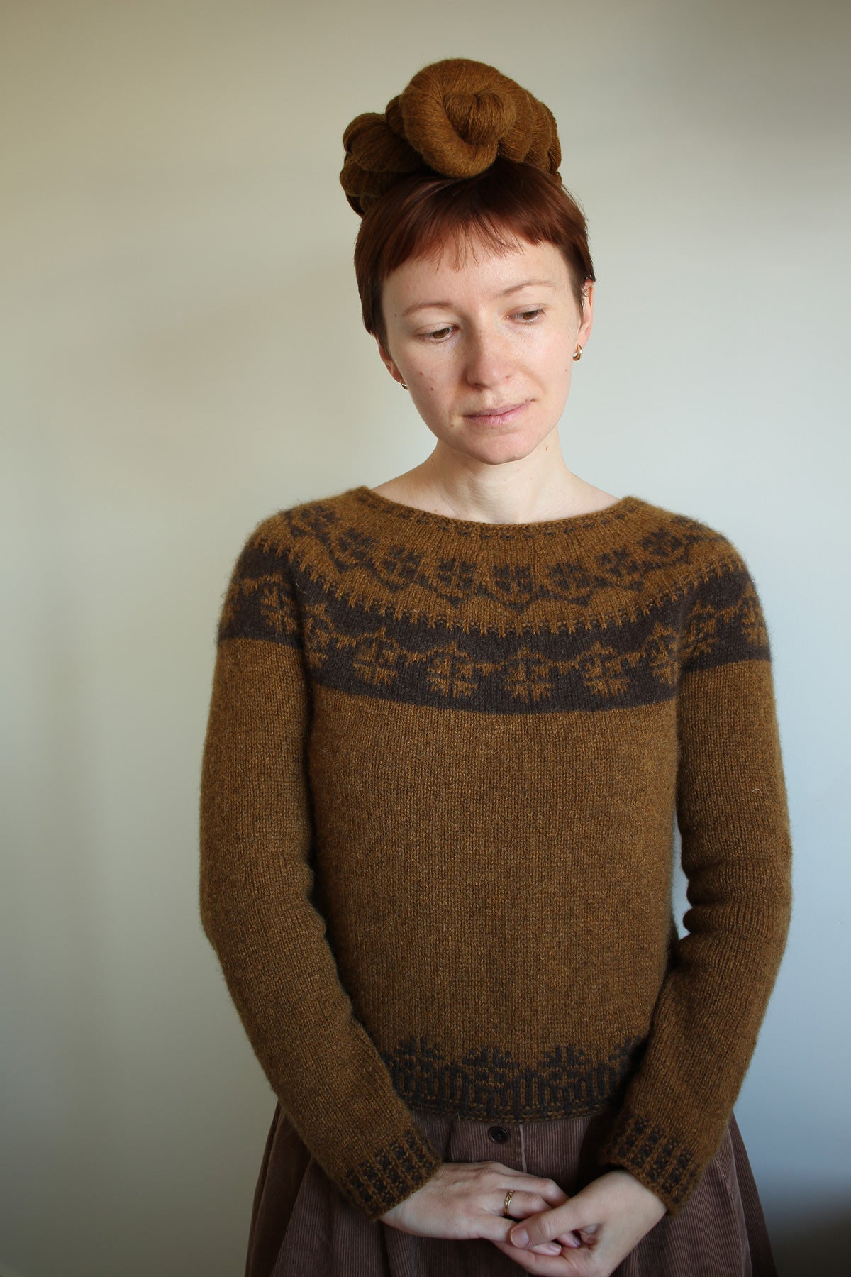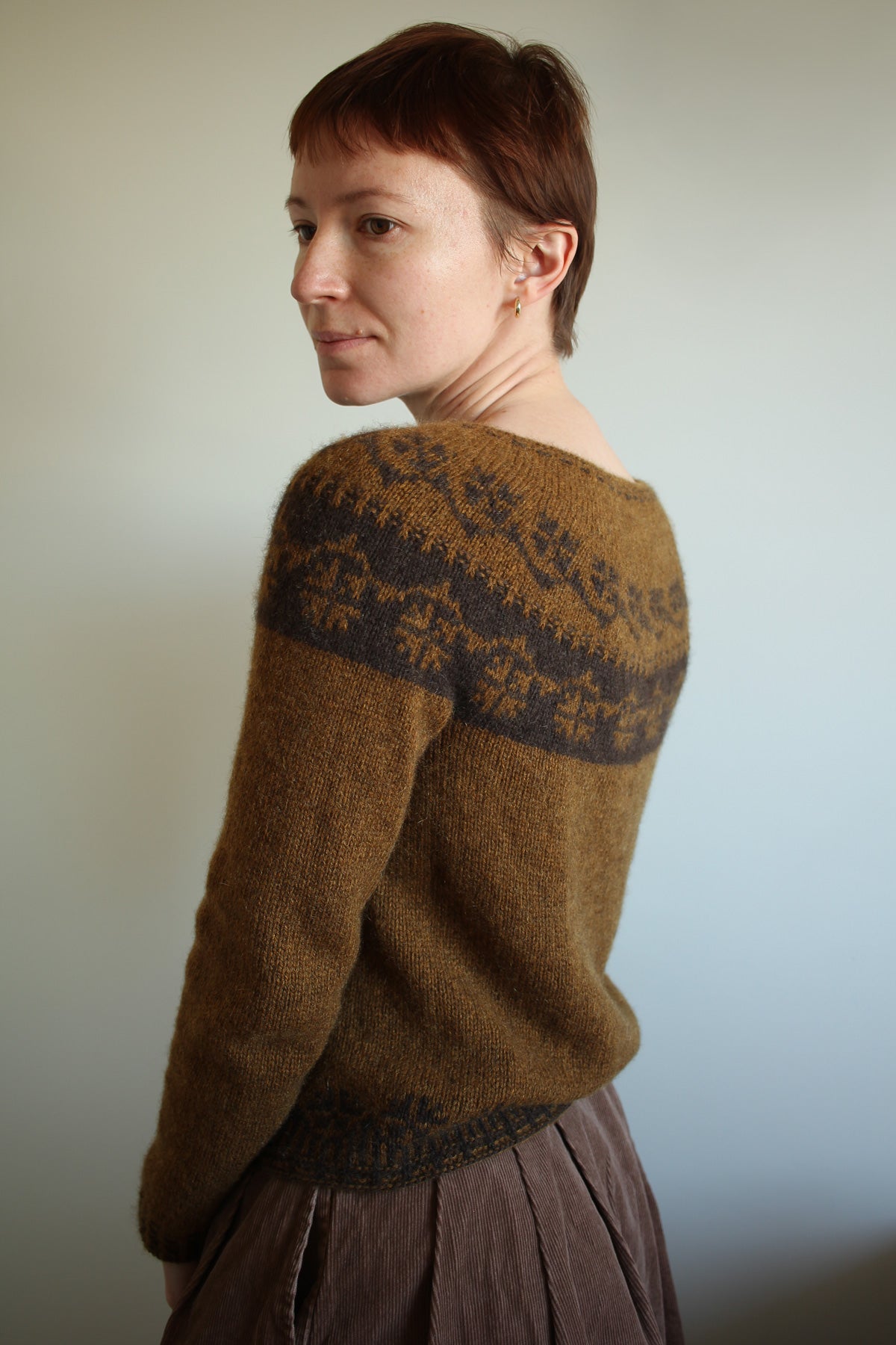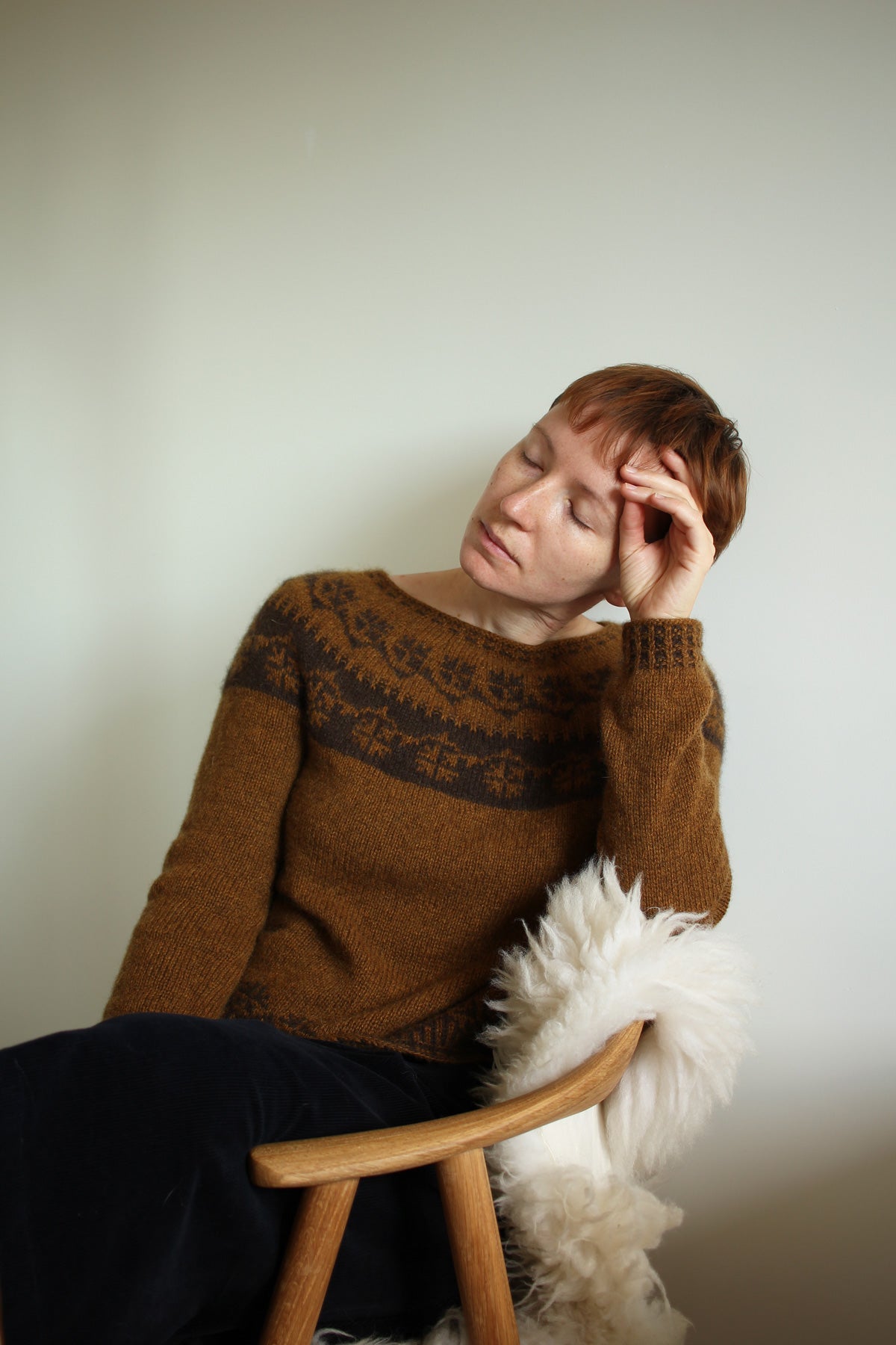This round-yoke pullover is knit top-down in the round and comes with the two charted versions of the yoke colourwork: with a light (MC) and dark (CC, as shown on the pictures) background. You can take a closer look at my sample and discover the design process with all its intermediate versions for your inspiration in Episode 20 of my podcast.