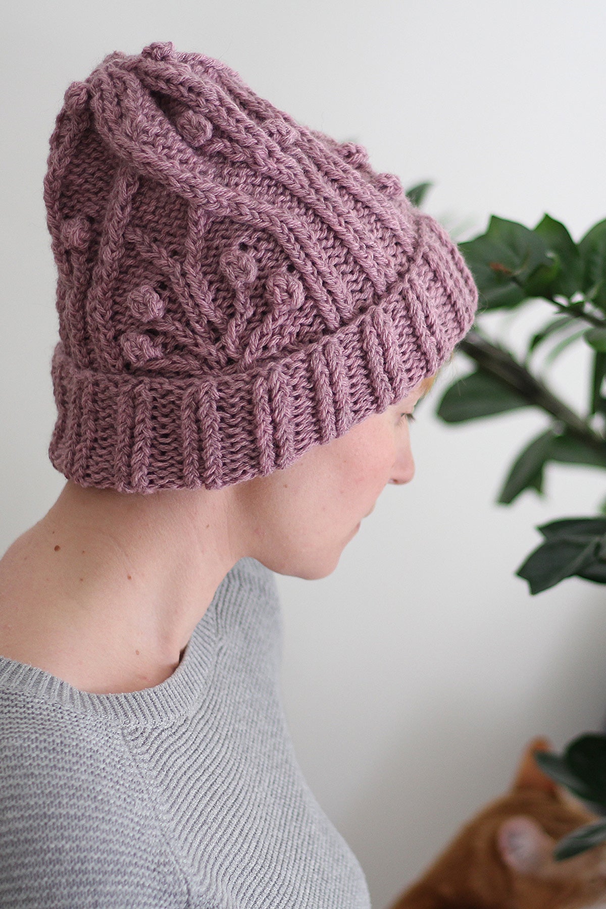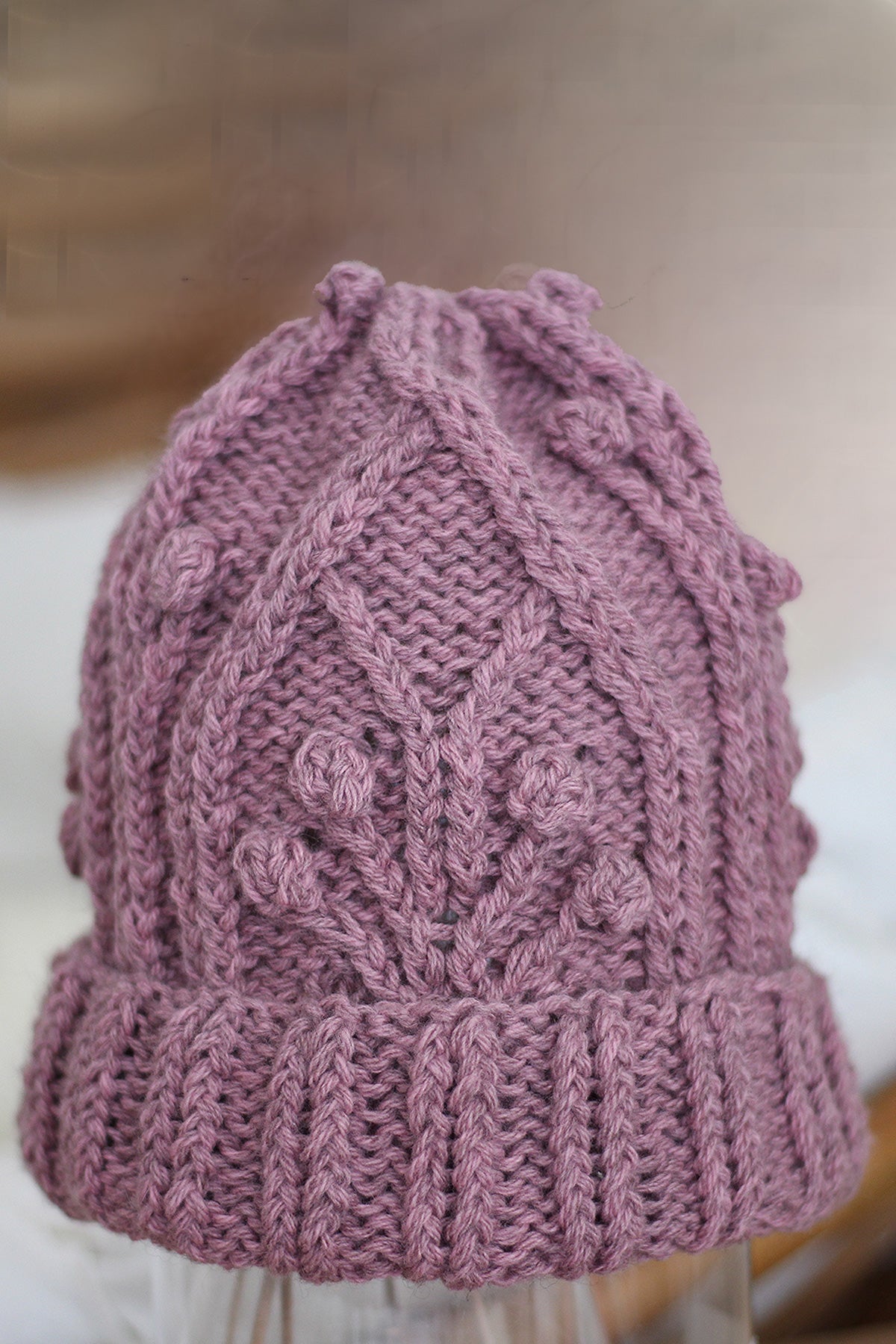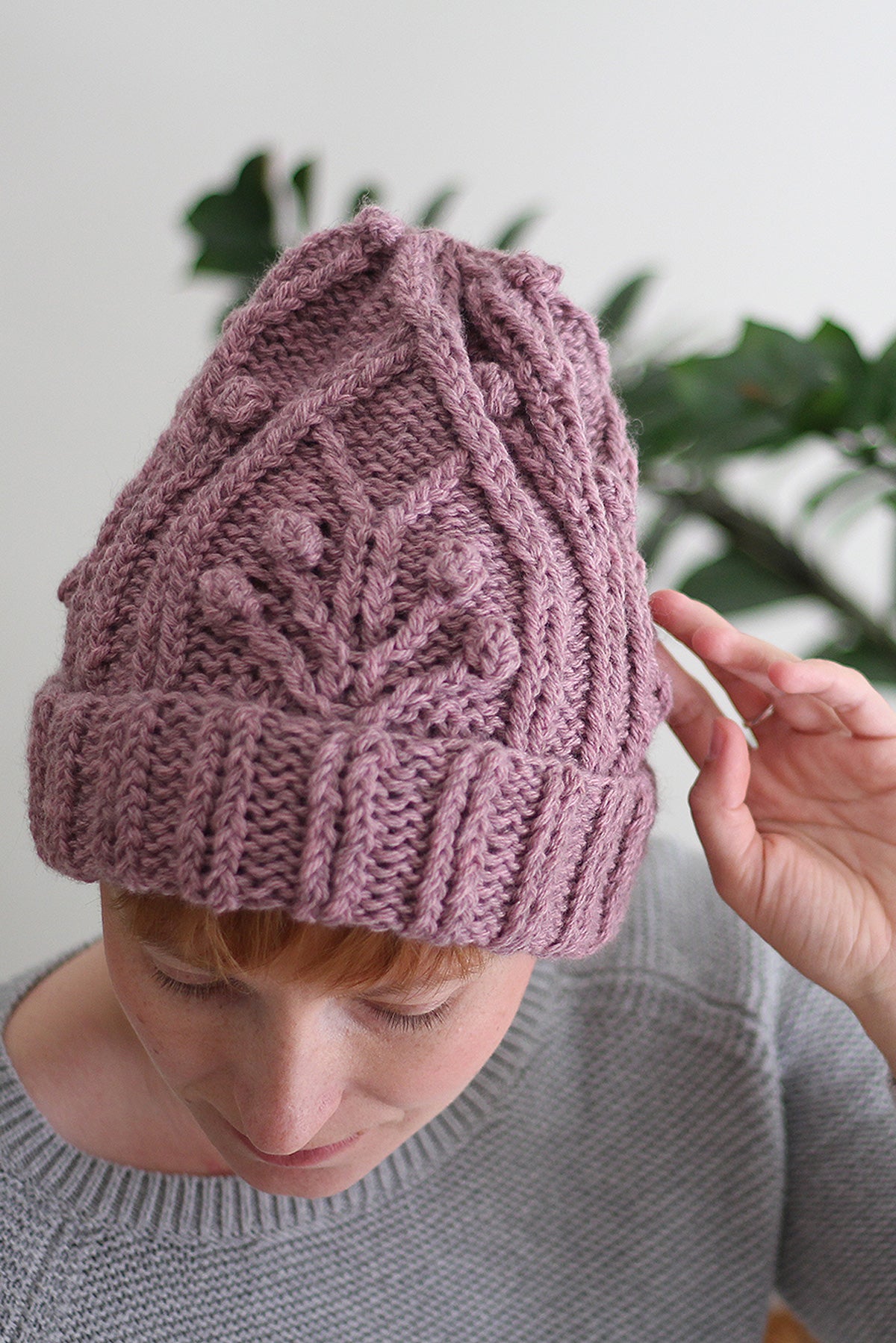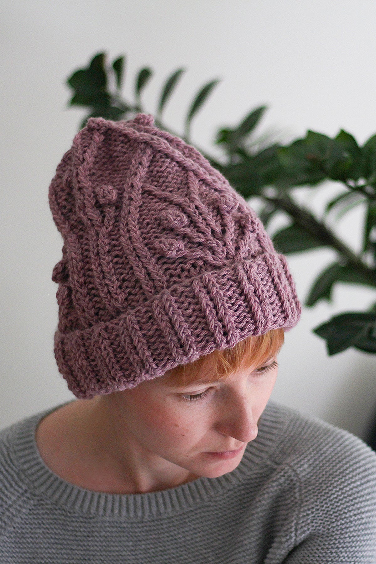 The hat is worked bottom up in the round, with a long folding up brim or a classic short one. The crown is pointed and can accommodate a small/medium size pompom.