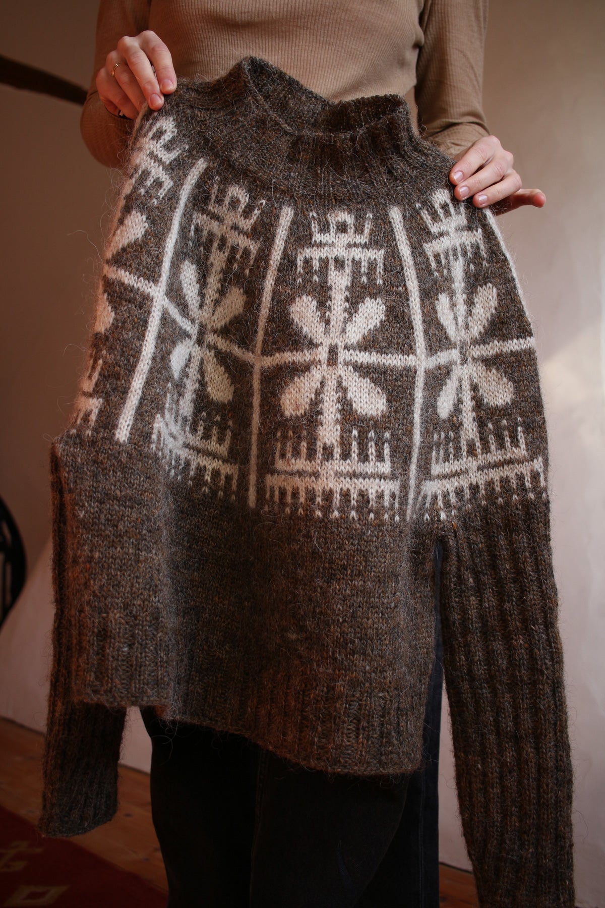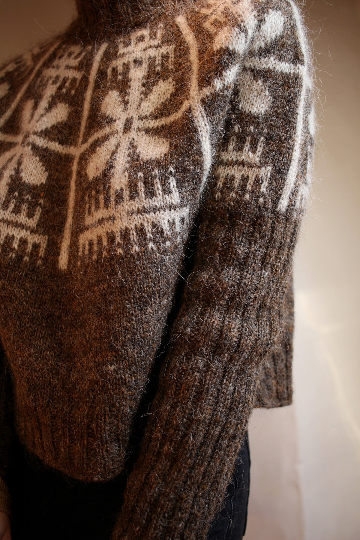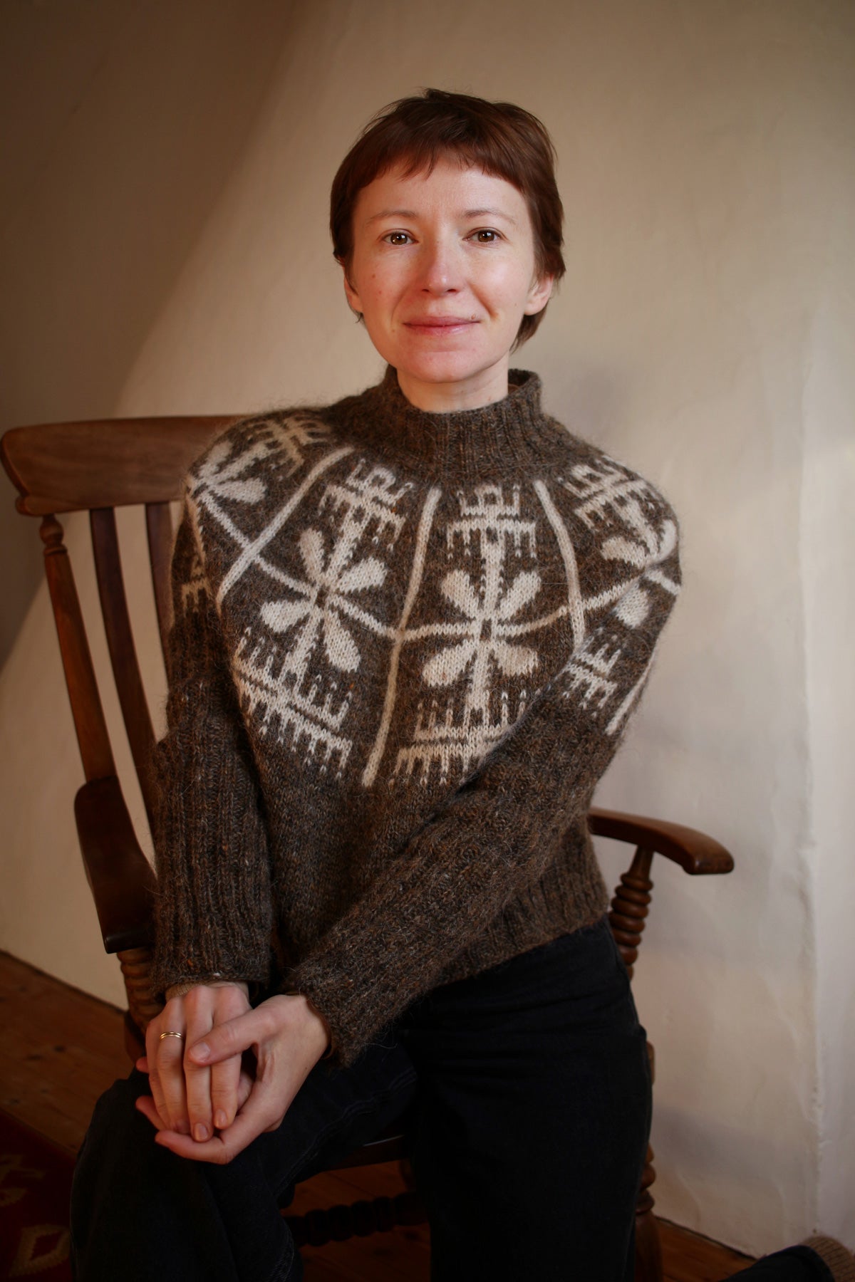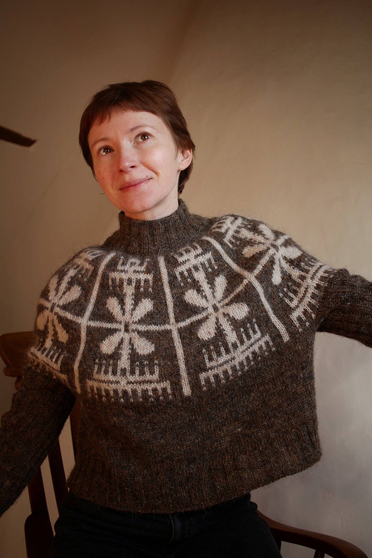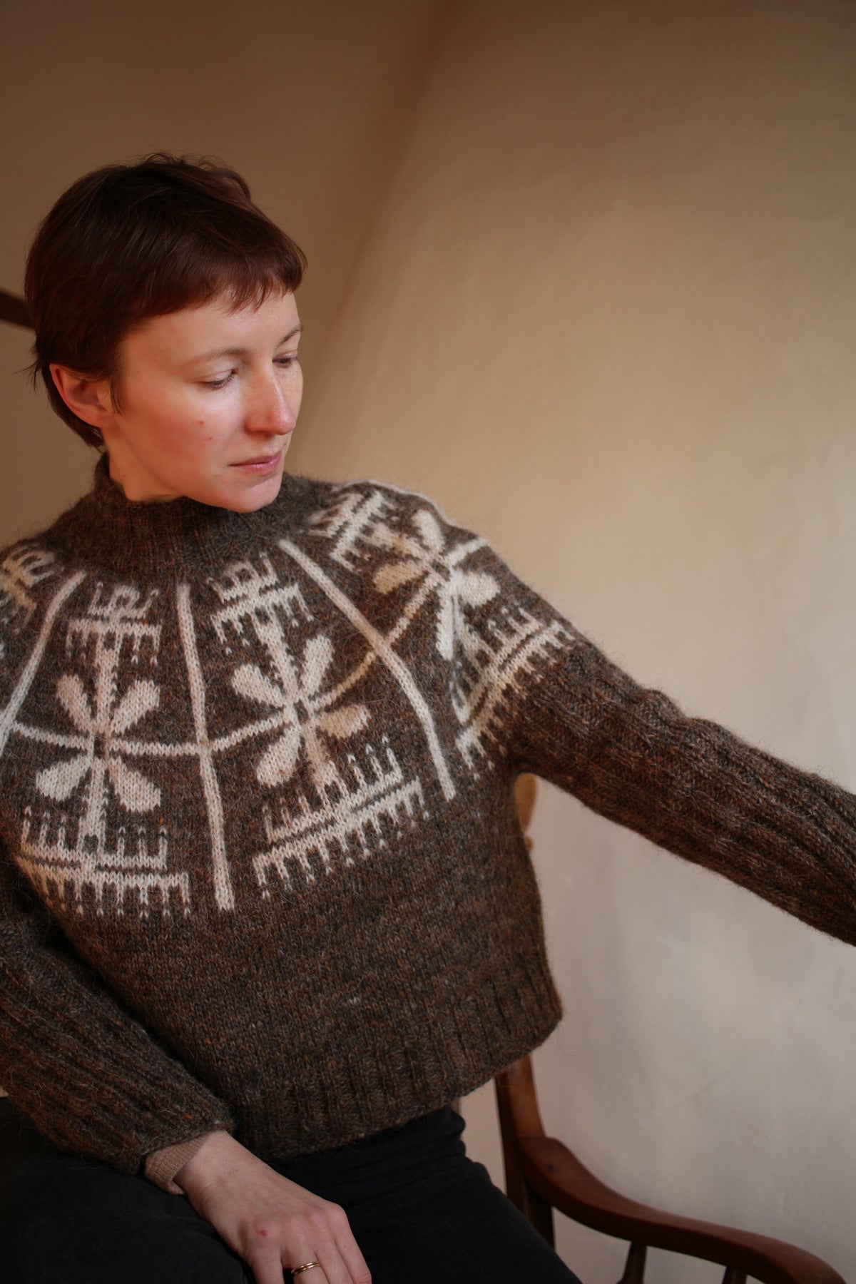 The sweater is knit top-down in the round. It’s a round yoke pullover with a deep yoke, almost like a swoncho, tapered sleeves and boxy body. In smaller sizes the yoke is as deep as the height of the colourwork section, in larger sizes you can choose to split for the body and sleeves as soon as colourwork is done. The neckline is shaped with short rows. All edges and the sleeves are worked in 2x2 ribbing.