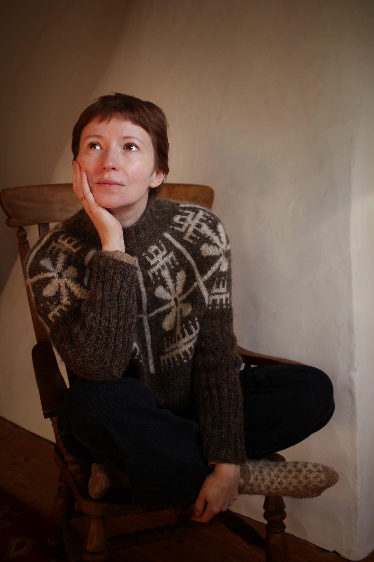 Knit in warm brown and soft white, Yardana also draws inspiration from pysanka — Ukrainian egg art rich with symbolism. Each intersection in the pattern represents the four corners of the world, a reminder of life’s interconnectedness. Rake-like motifs call for rain, their lines guiding falling raindrops to nourish the land. From that water, seedlings emerge, marking the beginning of a new cycle of life.