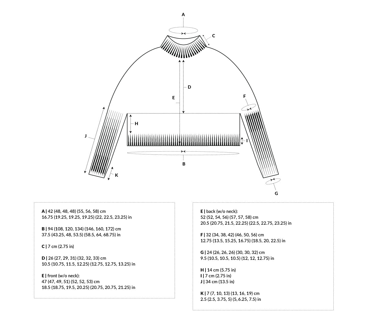 The pattern is written for seven sizes 1 (2, 3, 4) (5, 6, 7) with a finished bust circumference of ca. 94 (108, 120, 134) (146, 160, 172) cm // 37.5 (43.25, 48, 53.5) (58.5, 64, 68.75) in incl. ca. 25 cm (10 in) of the recommended positive ease.